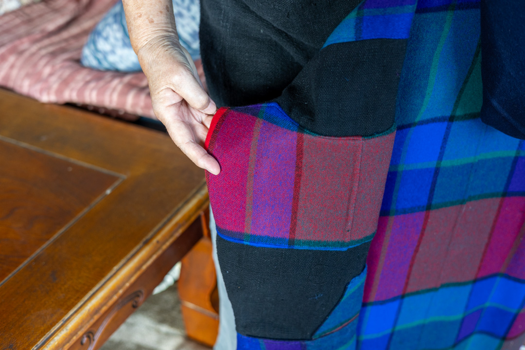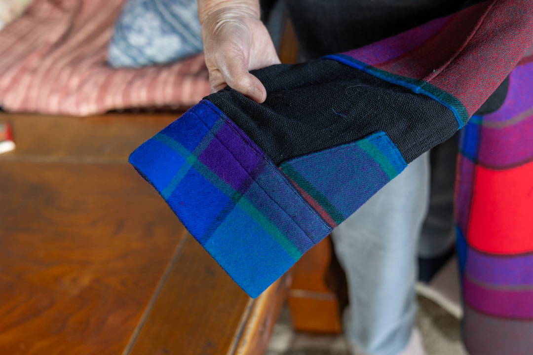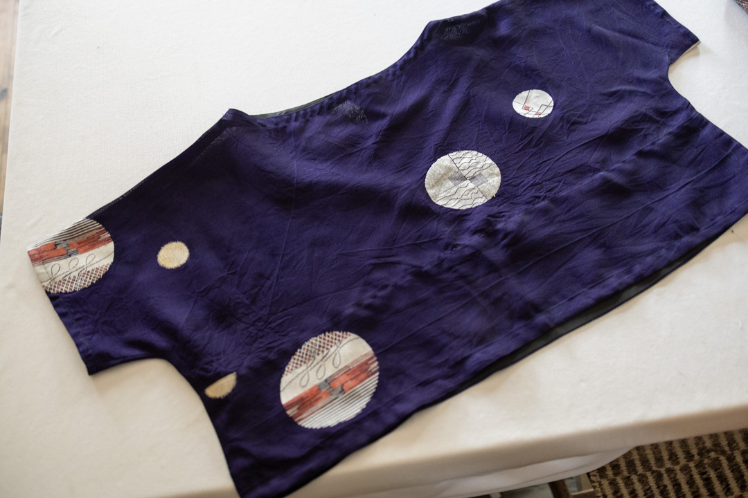 こちらはお姑さんが遺してくれた着物を「洋服にしてほしい」という依頼があったので、ノースリーブのワンピースと、その上に重ねる丈の短いプルオーバーに作り変えたものです。「タンスの肥やし」になっていたものが、タンスから出て、また使われていくのはうれしいものです。