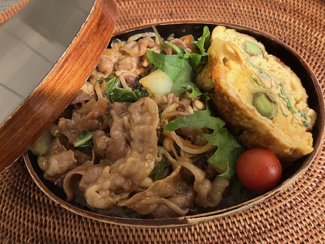 曲げわっぱにしてから、木のはし箱してみたり、弁当包みを本染手織りのもの、仕切りをシソの葉に換えてみたら弁当の時間が楽しみになった。