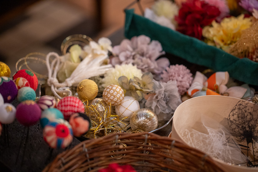 カゴや箱に盛られたベルベットの細いリボンや美しい刺繍の施された太いリボン、色とりどりの花やまん丸い飾りは、忘れていた私の乙女心を呼び覚ます。